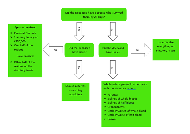 The simple flowchart below shows how your estate will pass in the event that you have no valid will at the date of death.
